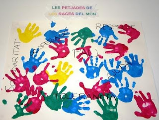AQUEST MURAL FORMA PART D'UNA SESSIÓ DE RACONS. CADA RACÓ TENIA A VEURE AMB LA SOLIDARITAT I LA COOPERACIÓ. ES PROPOSA ALS INFANTS QUE ESTAMPIN LA SEVA MÀ EN UN MURAL AMB LA PINTURA DEL COLOR QUE MÉS ELS AGRADI. UN COP ESTAMPADES LES MANS, S'EXPLICA QUE HI HA MOLTES RACES, IGUAL QUE LES PINTURES, PERÒ QUE TOTS SÓM IGUALS (COM LES NOSTRES MANS). ES DEMANA ELS ALUMNES QUE BUSQUIN PARAULES RELACIONADES AMB EL QUE ESTEM TREBALLANT PER ESCRIU-RE-LES AL MURAL. D'ENTRE LES PARAULES ESCOLLIDES TROBEM: "PAU, RESPECTE, AJUDA...". ELS ALUMNES TENEN LA IDEA D'ENVIAR AQUEST MURAL A L'ESCOLA "LA GRÈCIA" DE NICARAGUA (AGERMANADA AMB EL NOSTRE CENTRE), JUNTAMENT AMB UNES POSTALS QUE TAMBÉ VAN FER EN UN ALTRE SESSIÓ. AQUESTA NOMÉS ÉS UNA MOSTRA D'ALGUNES DE LES ACTIVITATS REALITZADES DINS LA UNITAT DIDÀCTICA "ELS MEUS AMICS DEL MÓN" MOLT RELACIONADA AMB EL PROJECTE DE COOPERACIÓ I SOLIDARITAT QUE ES PORTA A TERME A LA NOSTRA ESCOLA. ESPEREM QUE US AGRADI I QUE SIGUI ÚTIL ALS ALUMNES PER A CONÈIXER ALTRES REALITATS DIFERENTS A LA SEVA I APRENGUIN A SER MÉS SOLIDARIS I COOPERATIUS.